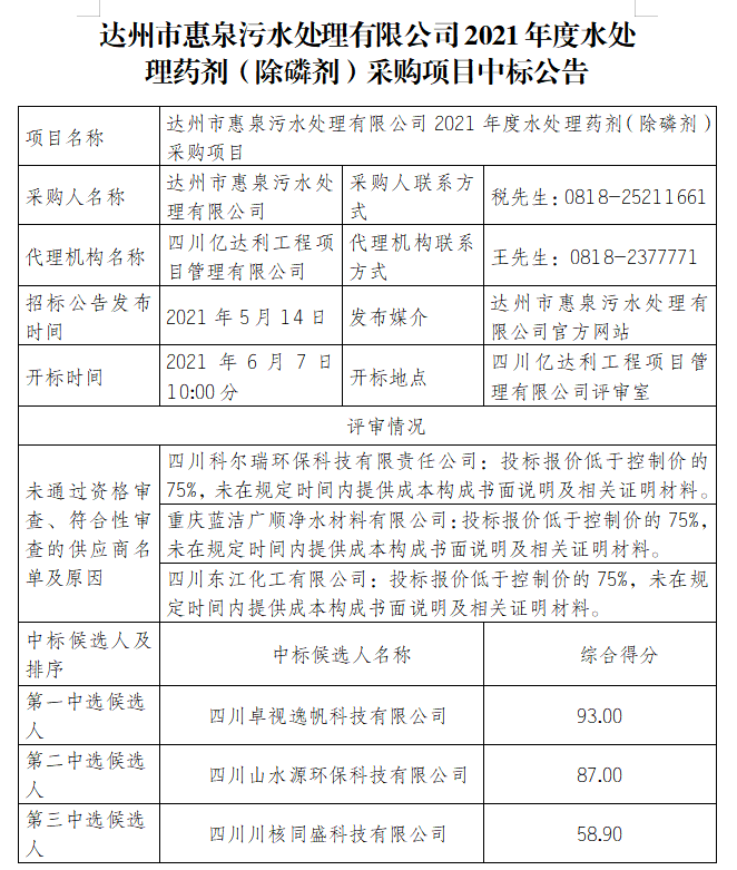標題:達州市惠泉污水處理有限公司2021年度水處理藥劑(除磷劑)采購項目中標公告